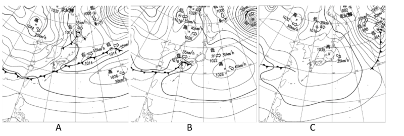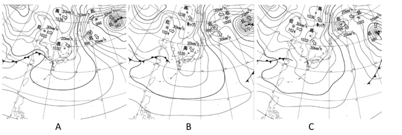 問題 3下の図は24時間ごとの連続した天気図です。日付の早いもの順に並べ替えましょう。