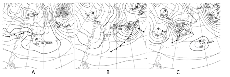 下の図は24時間ごとの連続した天気図です。